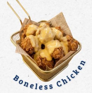 Boneless chicken, juicy and tender with crispy skin, drizzled with your choice of sauce.